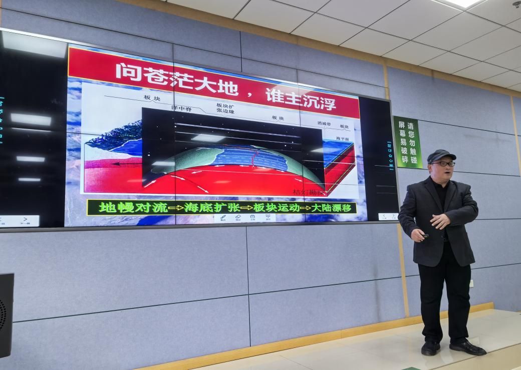 讲座以“趣话地球”为主题,围绕“认识地球、感恩地球、敬畏地球、关爱地球”四大维度展开。徐教授从地球46亿年的演化历程讲起,通过丰富的图片和实例,引领听众穿越时空,重返地质历史现场,探寻沧海桑田的痕迹,感受生命从起源到进化38亿年间的艰辛与辉煌。他不仅讲解了地球构造、板块运动、矿产资源等自然科学知识,更将视角延伸至人与自然的关系,深入剖析了自然资源的高效利用、自然灾害的成因与防灾减灾策略,以及人类活动引发的环境问题。